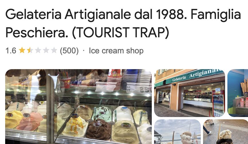 • On Google maps, check the reviews. It might sound obvious, but there are quite a few in Sirmione with low starred reviews. As I was writing this post, I even saw a bunch listed with the words “(TOURIST TRAP)” after the name, like in the screenshot below. I know I won’t be going there!